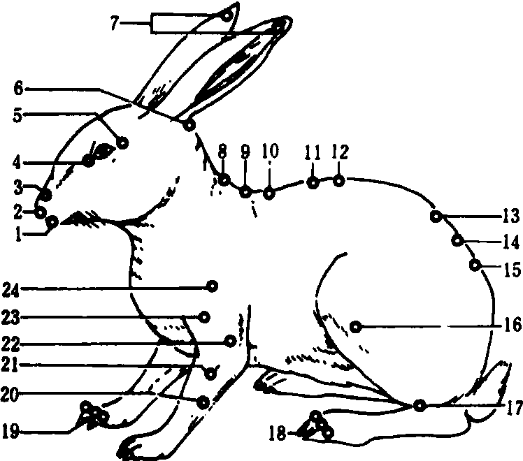 | 释义 | 兔腧穴acupoints of rabbits对兔体行针施灸治病的刺激点。参照牛、马和人体穴位以及临证实践而制定。应用的针具是人用毫针及三棱针。灸术与人医相似,也可用“线香”代替艾条施灸。常用的穴位,头部8个、躯干及尾部穴位22个、前肢穴位10个、后肢穴位11个,共计51个(图1~3)。