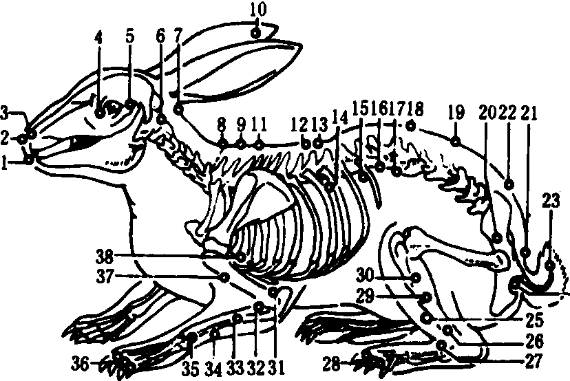 图2 兔的骨骼及穴位 1. 承浆;2. 山根;3.迎香;4. 睛灵;5. 太阳;6.风门;7. 天门;8. 大椎;9. 陶道;10.耳尖;11. 身柱; 12. 至阳; 13.筋缩;14. 肝俞; 15.脾俞; 16. 三焦俞; 17. 肾俞; 18.命门; 19. 阳关;20. 环跳; 21. 百会; 22. 尾根: 23. 尾尖; 24. 后海;25. 丰隆; 26. 阳辅; 27. 追风; 28.趾间; 29.上巨虚; 30.后三里; 31.肘俞;32. 曲池;33.前三里; 34. 四渎; 35.外关;36.指间;37. 臂臑;38. 抢风 太阳(taiyang) 外眼角后方颞窝中,左右侧各一穴。以毫针直刺0.2~0.3厘米。主治中暑、感冒、眼病。