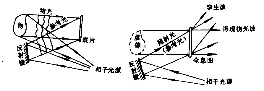 | 释义 | 全息照相Quanxi zhaoxiang采用“无透镜”两步成像法,在感光底片上同时记录下物体的全部信息(物光的振幅和位相)而获得立体像的新型摄影技术。全息照相分为两步:❶利用干涉法拍摄全息图(全息照片),如图1所示。相干光源发出的光,一部分照明物体,从物体上反射或散射的物光照到感光胶片上。另一部分直接照到感光胶片上,这束光称为参考光。物光和参考光在胶片上迭加干涉,产生的干涉图样即记录了物体的全部信息。这张具有干涉图样的胶片经过适当曝光、冲洗后,就是一张全息图。这一拍摄过程是一个记录或储存信息的过程。