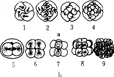 a.全裂的螺旋形卵裂 b. 全裂的辐射卵裂(海参) 1. 从4个细胞分裂成8个细胞 2. 从8个细胞分裂成16个细胞 3. 8细胞期 4. 16细胞期 5. 2细胞期 6. 4细胞期 7. 8细胞期 8. 16细胞期 9. 32细胞期 |