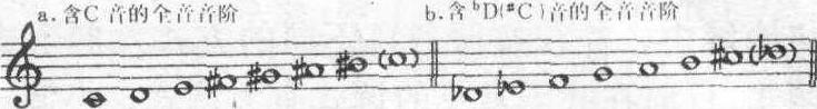相邻各音间均为全音(大二度音程) 的音阶,一个八度内只有六个音级,不含有主音。在十二平均律中,只有两种不同音响的全音音阶,即含有c音的和含有bD(#C)音的两种,在记谱时,可利用等音关系记成多种不同式样。