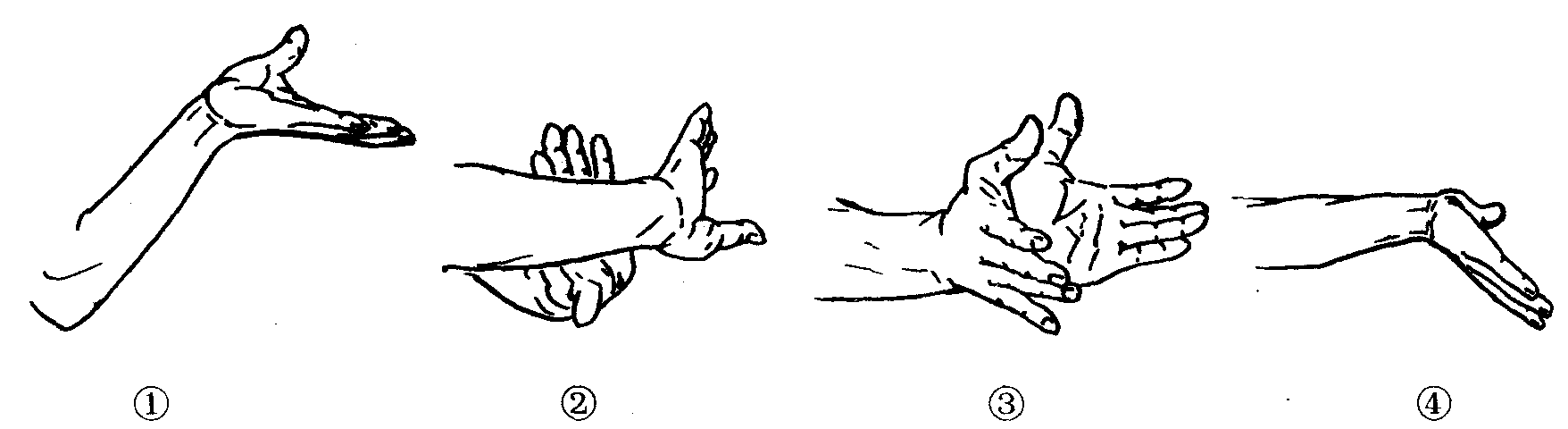 是指八卦掌练习时手的运动方法。主要掌法有❶穿掌:后掌掌心向上,掌指向前,从前掌下穿出的动作(图2—4—71—❶);❷蹋掌:以掌根为力点,自上而下,向前下方或向身体侧方击掌的动作(图2—4—71—❷);❸撞掌:双掌根靠紧,掌心朝前,以掌根为力点,向前撞击的动作(图2—4—71—❸);❹掖掌:掌心朝前,掌指朝下,以掌根掌心为力点,向前下击出的动作(图2—4—71—❹)。另外还有扣掌、螺旋掌、托掌、抄掌、拍掌等。