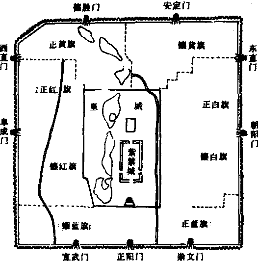 | 释义 | 八旗方位清代八旗满洲、八旗蒙古、八旗汉军在行军、驻营时所居位置,据五行相胜说而定。如: 京师镶黄旗居安定门内,正黄旗居德胜门内,并列北方,取土胜水之意; 正白旗居东直门内,镶白旗居朝阳门内,并列东方,取金胜木之意; 正红旗居西直门内,镶红旗居阜成门内,并列西方,取火胜金之意; 正蓝旗居崇文门内,镶蓝旗居宣武门内,并列南方,取水胜火之意。满洲驻防营房及旗地的分配,均按此方位进行。 八旗方位清代包括满洲旗人在内的八旗满洲、蒙古、汉军在行军、驻营时所居位置。据五行相胜说而定。如,京师镶黄旗居安定门内,正黄旗居德盛门内,并列北方,取土胜水之意;正白旗居东直门内,镶白旗居朝阳门内,并列东方,取金胜木之意;正红旗居西直门内,镶红旗居阜成门内,并列西方,取火胜金之意; 正蓝旗居崇文门内,镶蓝旗居宣武门内,并列南方,取水胜火之意。清代满洲驻防营房及旗地的分配,均按此方位进行。