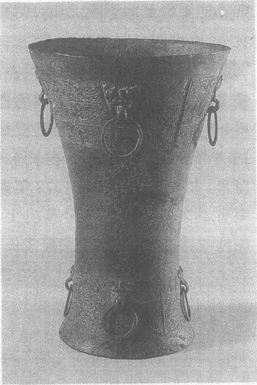 战国。高20厘米,口径13.5厘米。1970年於湖南省征集。湖南省博物馆藏。此杯敞口,束腰,平底。口下、足上饰相对的兽面衔环八个,并各有三道夔纹带。此器用途不明,花纹也较特殊,其形制在过去出土的铜器中很少见。