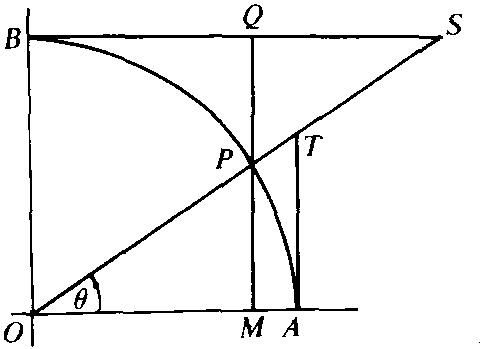 三角法的旧称。指一个角的八条三角函数线。(见图)即正弦线(MP=sinθ),余弦线(OM=cosθ),正切线(AT=tgθ),余切线(BS=ctgα),正割线(OT=secθ),余割线(OS=cscθ),正矢线(MA=versθ),余矢线(PQ=coversθ) 图中是单位圆的四分之一。