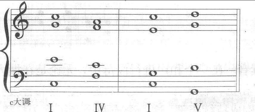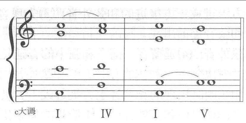当上述两种和弦连接法熟练地掌握后,随着不同三和弦、七和弦、转位和弦等的进入,和弦连接的形式也会出现多种不同的情况,如声部的跳进、前后和弦排列法的改变、重复音和省略音的不同等等。但是,和弦连接中的声部部是依声部进行平稳或调式音级的倾向的原则而进行的。 |