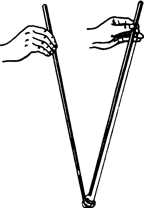 图4 切口手势 扩创 术者先将一个扩创钩挂在公鸡前一肋骨,再插入另一个扩创钩, 挂在后一个肋骨, 在开张扩创钩的同时,将切口扩大至2~3厘米。注意切口的上面,不应超过从腰角向前所引的水平线,以免损伤肾脏,引起大出血。 破膜 对体腔可用勺尖插入近侧创角的腹膜三角形破口内, 并将此体腔膜挑起, 用阉割刀切开。对包裹睾丸的膜, 可用勺将肠管向后拨开, 此时用镊子于睾丸系膜处夹起此被膜,随即以勺尖从提起处刺入,再以镊子从破口插入, 并在与勺尖共同配合下, 将被膜撕开, 以暴露睾丸。在剥开右侧睾丸被膜后, 即将此侧睾丸拨到脊柱一旁, 以便在直视情况下, 用镊子夹住肠系膜根部无血管处, 用勺尖刺穿肠系膜, 并向左右扩大, 摘除左侧睾丸。此步骤宜细心, 绝不能误伤大血管。 勒除睾丸 先用睾丸勺通过肠系膜破口, 将左侧睾丸轻轻掏到破口上面, 然后勒除右侧睾丸。在此之前, 应先用镊子轻轻夹住右侧睾丸前端,并稍稍提起,再用勺尖将睾丸与前胸气囊壁系膜挑断。注意不能损伤通入睾丸的血管。当右侧睾丸被勒除后,再以左手持睾丸套,右手将睾丸勺前端的棕丝圈带到右侧睾丸下方, 把睾丸套住。亦可将两侧睾丸同时套住( 图5)。如公鸡太大,应先摘除左侧睾丸;公鸡的睾丸小, 应先摘除右侧睾丸。因摘除上面睾丸后, 常伴有局部小量出血, 使局部模糊, 影响下步手术。