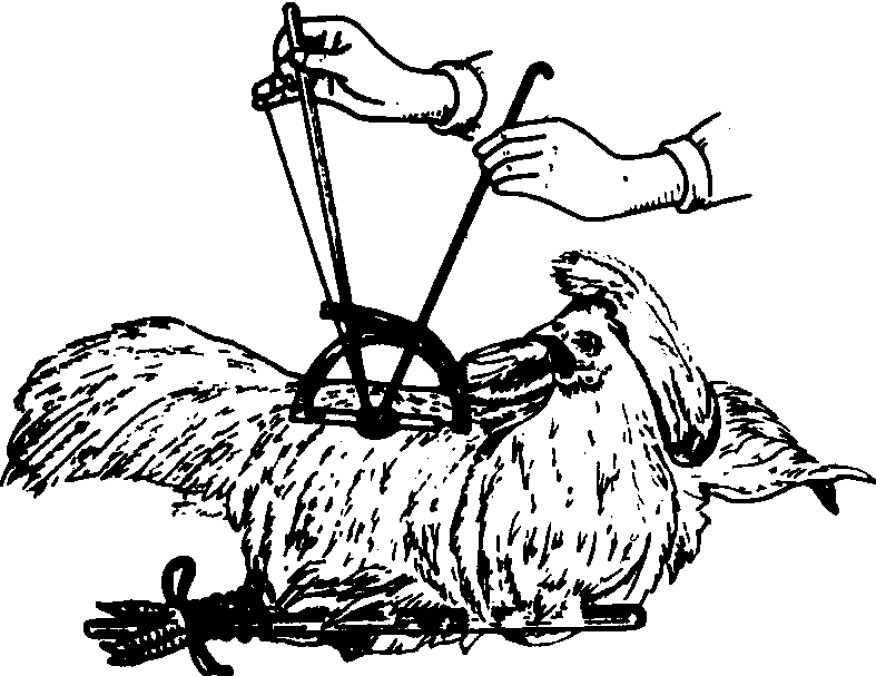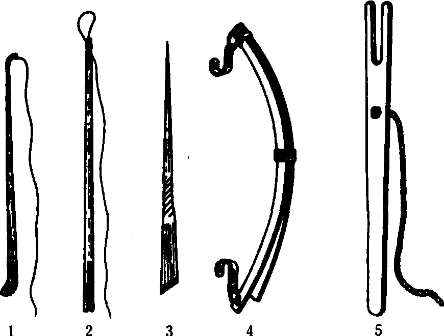 图1 公鸡部分脏器的位置 两睾丸之间,为腹主动脉,后腔静脉和肠系膜根部。睾丸多呈长圆形、黄色,也有的呈棱形,如燕麦状,黑色、灰色或黑黄花色。右侧睾丸偏前。 鸡的肋骨,一般为7对,个别为8对。肋骨间隙内有肋间肌,并有血管和神经沿肋骨后沿下行,故作切口时,应沿肋骨前沿。鸡的气囊较多,与术后气胀有关。 术前准备 检查鸡只的健康情况。健康的鸡,鸡冠鲜红,叫声宏亮。若有异常表现,如羽毛蓬乱, 翅膀不垂,精神萎顿等,均不宜施术。术前禁食半天。用公鸡保定法保定鸡只(见阉割保定法)。拔去术部的羽毛,周围的羽毛浸湿。术部、器械及术者的手指消毒。准备阉鸡刀、扩创器、套睾器、固定竹板等阉鸡器械。阉割刀:为一用金属特制的三角刀。睾丸勺(套睾器):可用铜丝或不锈钢丝制成。一端为盛鸡睾丸的勺。睾丸套: 一般用竹削制。一端较大, 头端栓一根活动的马尾或棕丝; 另一端尖细,作破膜用。弓攀(扩创器):可用竹或有弹性的金属薄片制成。为双层,可弯曲,两端栓一活动创钩, 以便在打开腹腔时扩创用(图2)。