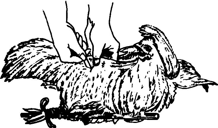 图5 套取鸡睾丸的方法 在摘除公鸡睾丸时, 睾丸套应用左手拇指、中指和食指夹稳, 将睾丸套住后,睾丸套头应接近睾尾,并稳住不动, 随即以无名指和小指将棕丝向上提动, 使套收紧,睾丸即落入勺中, 然后将睾丸和勺一起取出,以免睾丸落入腹腔 (图6)。睾丸摘除后, 即可整理切口。 切口如有体腔膜粘附, 应送回腹腔, 也可将多余的腹膜剪去一小块。切口一般不缝合。松开交扭翅膀,解除保定, 让公鸡安静休息。 注意事项 ❶为了顺利摘除睾丸, 对与睾丸相连系的被膜, 应一一加以分离, 方能使棕丝贴紧睾丸根部。 ❷手术中不能损伤脊柱下的大血管。如手术中或摘除睾丸后有局部出血时, 可立即用勺盛冷水压迫出血处片刻, 并取出血凝块, 以免引起内脏粘连。大公鸡在阉割前, 可喂几勺冷水。 ❸摘除睾丸时, 务必保持睾丸完整, 不能弄碎。 ❹术后宜单独喂养, 并注意创口有无气肿出现, 若有, 应放气。