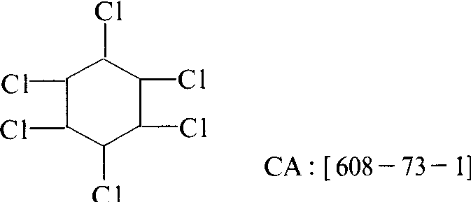 工业上将氯气通入苯中,在光的照射下,于25~35℃时发生加成反应制得六六六。这种方法生成的六六六是许多立体异构体的混合物,称为六六六原粉。现已从原粉中分离出多种立体异构体,以甲(α-体) 、乙(β-体) 、丙(γ-体)、丁(δ-体)和戌 (ε-体)等5种异构体为主要成分,其中只有丙体六六六才具有明显的杀虫作用,其他异构体杀虫效力极低,统称为无毒异构体或无毒体。因此,在实际应用和生产中,就以丙体六六六含量作为六六六的有效成分标准。一般生产的六六六原粉含丙体六六六13%~15%。利用各异构体在有机溶剂中溶解度不同,通过分步结晶法进行浓缩,可制得含丙体高达90%的丙体六六六。含丙体99%以上的六六六称为“林丹”。 六六六是有机氯农药的主要品种之一,生产简单,成本低廉。其原粉可以加工成粉剂、可湿性粉剂、乳油、颗粒剂、烟剂等,供选择使用。农用主要有1%,6%,20%的粉剂,6%,20%的可湿性粉剂,10%的乳剂等。六六六杀虫范围很广,对刺吸口器和咀嚼口器的害虫均有效,在农林、卫生、畜牧等部门都可应用。主要通过胃毒、触杀和熏蒸来杀死害虫。六六六是神经毒剂,使昆虫神经兴奋,动作失调,痉挛,麻痹跌倒,最后死亡。但长期使用能使昆虫产生抗药性。六六六对人体、家畜也能产生毒害,使大脑皮质的兴奋和抑制过程发生障碍,引起末梢神经和中枢神经损害,严重的也可死亡。长期使用六六六还会积累残毒而引起公害,因此,许多国家已限制或禁止使用。我国随着高效、低毒、低残毒优质农药的发展,对六六六的使用也在逐步减少,1983年起已停止生产。 六六六应贮存在阴凉、干燥的库房,防止受潮与日光曝晒,避免和碱类物质接触。使用时要严守规定的用药量,疏菜采收前半月、果树开花期结束后不能使用。 六六六BHC;HCH残留性很强的广谱有机氯杀虫剂,化学结构式: