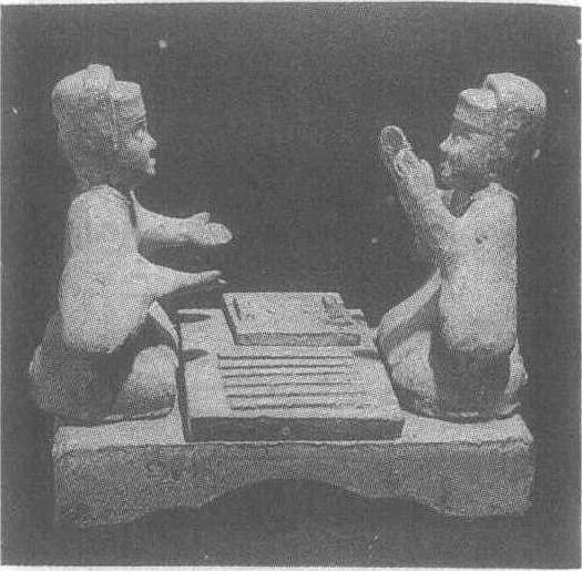 | 释义 | 六博陶俑东汉。高24.2厘米,底宽19.2厘米,座长28厘米。1972年河南省灵宝县张湾村3号墓出土。河南省博物馆藏。这组陶俑生动地表现了二俑对博前的情形。两俑相对而坐,一俑伸出双手似在请对方先行,神态洒脱、轩敞,显示出豪爽、乐观的性格。与其相对的俑举起双手,掌心向外,似在回请,表情和善,谦逊。这组陶俑的雕塑手法简练,人物特点和行为捕捉准确,表现力强,具有很强的艺术感染力,充分体现了东汉时期雕塑工匠的高超技艺。陶俑原施有绿釉,现已大部分脱落。六博,本作“六簙”“陆博”,古代博戏。十二棋,黑白各六,二人相博,每人六棋,因此得名。