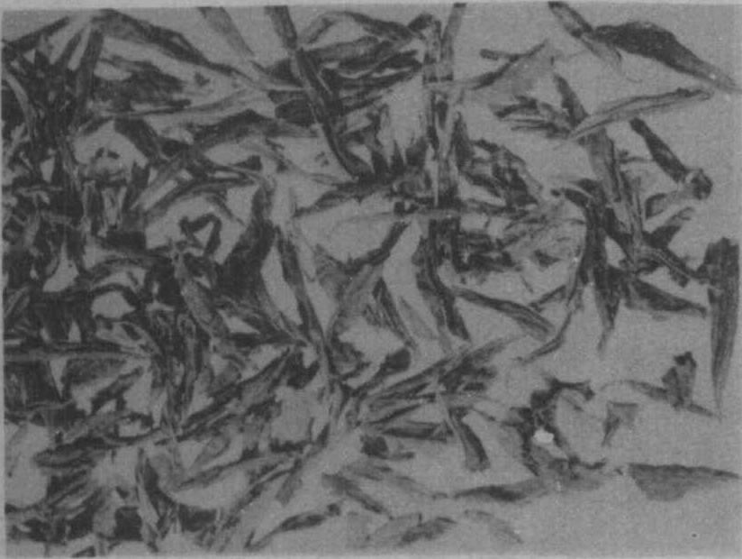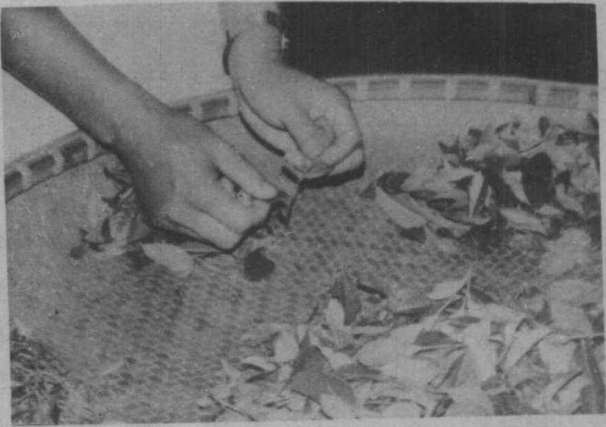 图1 六安瓜片 瓜片在4月下旬至5月上旬采制, 采摘标准为开面的一芽二、三叶。制法分扳片、炒片(杀青)和烘焙三道工序。扳片是片茶的特有工序, 用手将梗、叶分离, 老嫩叶分开, 以便分别炒制(图2)。炒片分生锅与熟锅。先炒生锅, 后转到熟锅。生锅温度高, 起杀青作用; 熟锅温度低, 兼有整形作用。投叶量每锅嫩片为50~100克, 老片为250克。炒时用小扫把轻推着叶片散开, 沿锅壁转动均匀着热。熟锅要适时拍打,固定片形。炒老片把子要重些, 使片形缩小。炒到嫩叶三成干、老叶四五成干时出锅。烘焙分毛火(初烘)、小火、老火三次进行, 以优质木炭为燃料, 火温一次比一次高。毛火温度控制在100℃左右, 烘至含水量约9~12%时出烘, 经拣剔后进行烘小火, 火温比毛火高。两人用大烘笼抬烘, 投叶量比毛火多。翻茶要轻、勤, 烘至九成干时下烘、摊凉、装篓, 放置1~2天后烘老火。老火采用高温明火, 每隔几秒钟翻茶一次, 直烘至叶面上霜, 手能碾成粉下烘。趁热用镀锡铁皮筒或白铁筒装实, 并加盖用锡焊密封。
