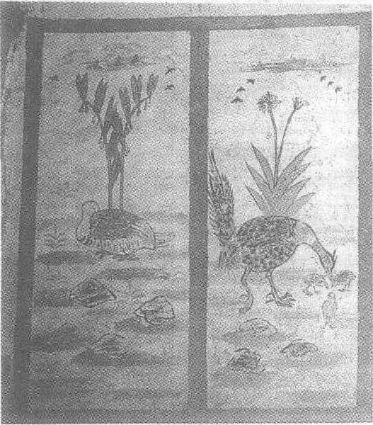| 释义 | 六屏式花鸟图壁画唐。纵150厘米,横375厘米。新疆维吾尔自治区吐鲁番市阿斯塔那古墓群217号墓墓室后壁壁画。1972年发掘,此图画红色边框,以模仿六曲屏风,红框内分绘六幅花鸟。画面分别以一只野鸡、野鹅、鸳鸯为主,衬以兰花、百合、小草、石块等。野鸟的头部有流云、隐现的山峦及一行行飞燕。此画采用中原的传统画法,以墨线勾勒,平涂填色,色彩十分鲜艳,具有极强的装饰性。