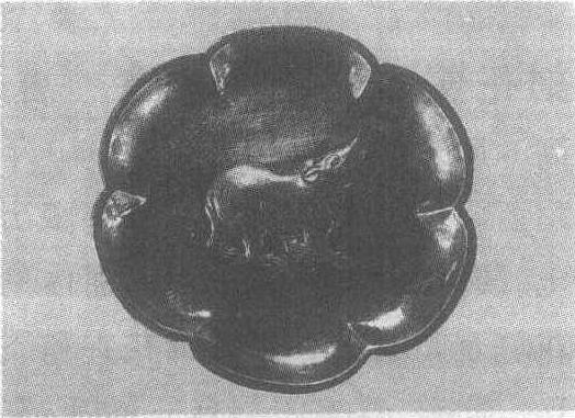 唐。高1厘米,口径13.4厘米。1970年陕西省西安市南郊何家村窖藏出土。陕西省博物馆藏。此盘边缘呈六花瓣形,盘中有一立熊,熊作张口待食或嚎叫状。熊本为笨拙而凶猛的动物,但经古代匠师的精心设计,却显得温驯可爱而颇具装饰意趣。