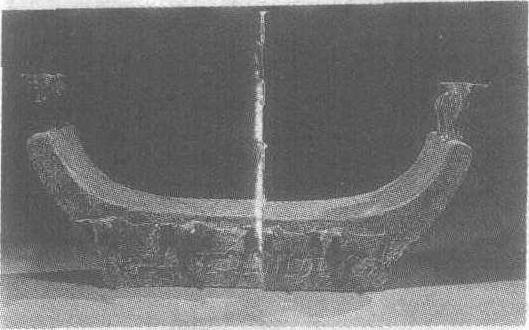 战国。长69.4厘米。云南省江川李家山出土。云南省博物馆藏。枕呈马鞍形,两端斜向上翘,顶端各立一牛。正面以勾连云雷纹为地,上刻虎纹和浮雕四牛,牛首圆雕突出呈立体状。这种集线刻、浮雕、圆雕浑为一体的艺术作品,别具一格,妙趣横生,是极富装饰韵味的青铜佳作。