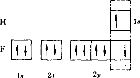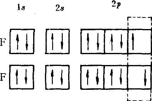图1 氟分子轨道表示式 氟分子中的两个氟原子各有1个2p轨道上的未配对电子,这两个自旋方向相反的2p电子,互相填充未充满的2p轨道,达到配对,使每个氟原子都具有氖原子的电子层结构。例如,氟化氢分子的轨道表示式,见图2。