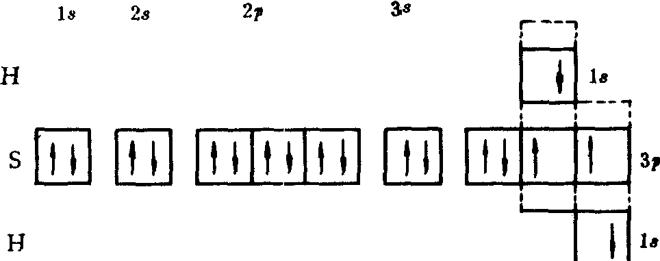 氟化氢分子中的氢原子的1s轨道和氟原子的2p轨道上,各有1个未配对电子,这2个自旋方向相反的电子,互相填充未充满的轨道达到配对,使氢原子具有氦原子的电子层结构,氟原子具有氖原子的电子结构。例如,硫化氢分子的轨道表示式,见图3。