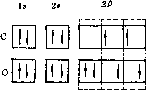 图3 硫化氢分子轨道表示式 硫化氢分子中的两个氢原子1s轨道上,各有1个未配对电子; 硫原子的3p轨道上,有2个未配对电子,它跟自旋方向相反的两个1s电子,互相填充未充满的轨道达到配对,使氢原子具有氦原子的电子层结构,硫原子具有氩原子的电子层结构。例如,一氧化碳分子的轨道表示式,见图4。