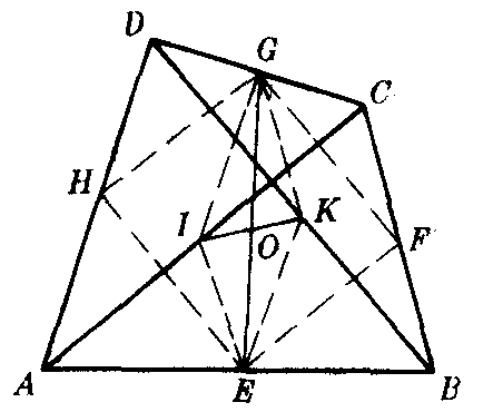 图2 三线共点问题是共点线问题的基础.证三线共点,可先证其中两线交于某点,然后将此点与第三条直线上一点相连,而证它与第三条直线重合.有时也可以借助于某些特殊点的唯一性证明. 例如,四边形中,两组对边的中点连线及两对角线的中点连线共点. 如图2,在四边形ABCD中,E,F,G,H分别为AB,BC,CD,DA中点,K,I分别为对角线BD,AC中点,可证EG,FH,KI三线共点. |