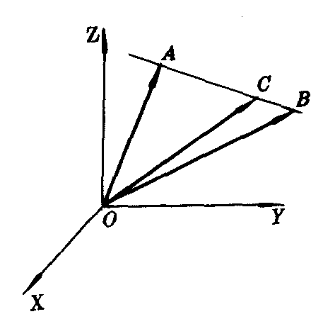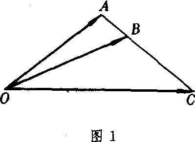 图1 把以上定理及推论用于对空间三点位置向量的讨论(图1),可以相应地得到: 定理 空间三点A,B,C共线的充要条件是存在不全为零的m,n,l,满足m+n+l=0,且使mA+nB+lC=0成立. 把向量减法 =B-A, =C-B, =C-A引入前面的第一个定理,就可以得到这个定理.推论1 若三点A,B,C不共线,等式m+n+l=0和mA+nB+lC=0同时成立,充要条件是m=n=l=0. 推论2 设点A,B相异,则点C与A,B共线的充要条件是存在实数λ,μ,使C=λA+μB,且λ+μ=1,当且仅当C与A,B相异时,λ和μ都不为零. 推论2的几何意义可以从图2中得到解释: ❶C点在相异两点A,B所确定的直线上滑动,则任一时刻的C都可表成λA+μB,并且λ+μ=1.当C与A重合时,λ=1,μ=0.当C与B重合时,λ=0,μ=1.当C与A,B相异时,λ和μ都不为零.