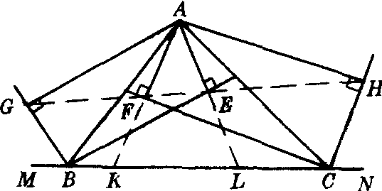图3 证明 如图3,△ABC的顶点A,在另外两个角的内、外平分线上的射影分别为E,F,G,H.连结EF,EG,FH.延长AF,AE交BC直线于K,L,易证E,F分别是AL,AK中点,所以EF∥BC.又AEBG是矩形,则∠BEG=∠EBA=∠EBC,因此EG∥BC.同样FH∥BC.因此E,F,G,H四点共线. |