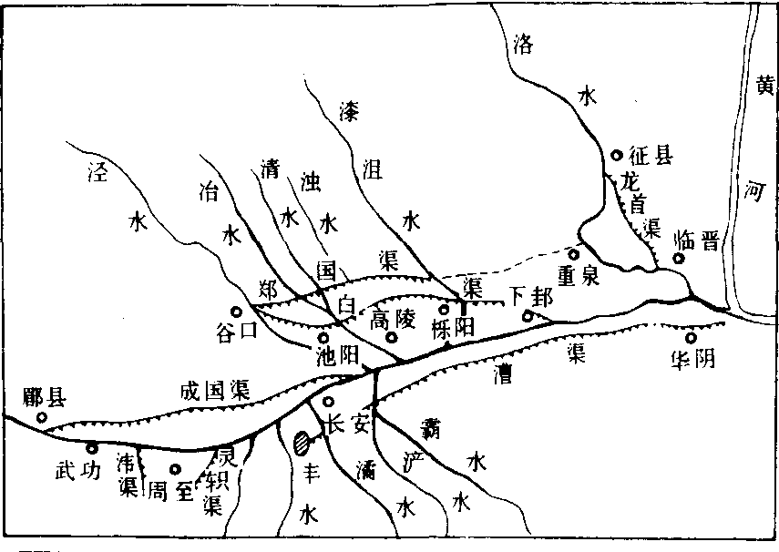 西汉关中水利分布图 樊惠渠。该渠特点是在泾水中筑有桩基堆石分水堰。汉代渭南的丰水、浐水、灞水等也有灌溉之利,成为关中种植水稻的地区。三国两晋南北朝时期,这时南北处于分裂割据局面,但关中在水利工程上,仍有少量的维修和扩建。如曹魏青龙元年(233)重开成国渠,渠向上延伸引千水,扩大了灌溉面积;又引洛水筑临晋陂,此二项工程共溉舄卤之地3000余顷。377年,前秦苻坚征发3万人,曾对郑白渠进行了一次整修。以后到西魏大统十三年(547),又修理白渠一次。大统十三年还修建成国渠与漆水河的交叉工程六门堰,解决成国渠过漆水河和安全渡汛的问题,并节制来水以供灌溉。大统十六年又在富平县筑堰,称为富平堰,可能是在石川河上筑堰引水灌溉。北周保定二年(562)在今大荔县修建龙首渠,渠首可能在西汉龙首渠下游,渠道不再通过商颜山。 唐代,关中水利事业又一次迅速发展。除修建漕渠,改善水运条件外,古老灌区普遍进行了修复和扩建工程,渠系分布加密,水工技术进一步发展。郑白渠从原来的两条支渠,增为太白、中白和南白三大支渠,武德二年(619)又引白渠水注入下邽县金氏二陂,灌溉屯田。尽管富商大贾在郑白渠上“竞造碾硙,堰遏费水”,但在永徽六年(655)仍可溉田一万余顷。以后为了维护郑白渠的灌溉面积,多次拆除豪富在渠上所立碾硙。宝历元年(825),高陵县令刘仁师又在中白渠上修筑彭城堰,下分4条支渠,即中南、高望、禑南及原来的中白,称为刘公四渠,扩大了灌溉面积。大和元年(827)又修高陵、醴泉、富平等10县渠堰斗门,完善渠系建筑。在郑白渠首泾河上唐代可能已建有拦河壅水石坝,称为“将军翣”。渠口砌有6孔石闸门,称为“洪门”。对成国渠也多次修治。尤其大力维修六门堰。其中咸通十一年(870)维修规模尤大,使韦川、莫谷、香谷、武安诸水汇入六门堰,灌溉武功、兴平、咸阳、高陵等县田2万余顷,其利与泾白不相上下,号称渭白渠。在咸亨三年(672)前,还兴修了属成国渠系统的升原渠。该渠上引千水,经虢镇西北周原东南流,再合漆水河入六门堰,除灌溉农田外,还兼负向长安浮运岐、陇木材。唐代又重建引黄引洛灌溉工程。武德七年(624),云得臣自龙门引黄河水溉韩城县田6000余顷,开元七年(719),姜师度引洛水及堰黄河入古通灵陂,通过引水种稻洗碱,使朝邑、河西(今合阳县东)二县2000多顷盐碱荒地成为膏腴稻田。此外,渭南长安、华阴一带也兴修了许多小型渠道。唐后期在郑白渠等灌溉面积缩小的情况下,为了维持水稻种植业,还在关中推广使用水车。 唐代以后,关中灌溉事业逐渐衰退,大型工程减少,主要集中在维护引泾灌渠上,而小型灌渠修建增多。宋以后,因泾河河床不断刷深,泾渠渠首逐次移向上游,渠名也随之改变。宋代叫丰利渠,元代叫王御史渠,明代叫广惠渠、通济渠,清代叫龙洞渠。这些渠口都开凿在岩石岸上。丰利渠、王御史渠靠泾河一边的引水渠岸,俱用方石砌筑。明代广惠引水渠穿凿大小龙山,隧洞长一里多,先后用了17年时间。明代除引泾水外,还兼用大小龙山的泉水,灌溉面积只有8000顷。清代乾隆以后断泾水,只引泉水,灌溉面积仅有200余顷。此外,明代成化时还一度重开引渭渠道通济渠,宏治间重开引千水的利民渠,共溉田1000多顷,两渠渠线大致和曹魏成国渠西线相当。在古渠灌溉面积大为缩小的情况下,为了抗御干旱灾害,明清时关中小型水利工程兴建很多。如清乾隆时统计西安等47个州县共有灌渠1171条,灌田64万余亩。明清时,尤其在清代乾隆后重视发展关中的井灌事业。 |
