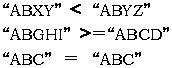 关系运算符对两个同型的量进行比较, 判断它们之间某种关系是否成立。如果成立则关系表达式取值为“真”,记作1;否则取值为“假”,记作0。关系表达式的值也叫逻辑值。 算术型量之间的比较就是通常意义下的比较, 需要注意的是最好不要比较两个实型量是否相等。 BASIC允许两个字符型量比较大小, 比较方法是自左至右逐对比较两字符串的字符的ASC Ⅱ码的值(参见“ASC Ⅱ码”)。数字0到9的ASC Ⅱ码的值依次为48到57, 字母A到Z的ASC Ⅱ码值依次为65到90, 例如下列三个关系表达式都成立, 其值均为1: ![]() 而下列关系表达式不成立, 逻辑值均为0: ![]() 最后一个表达式等号两端的字符串不相等, 是因为右端的串末尾多一个空格符。 |