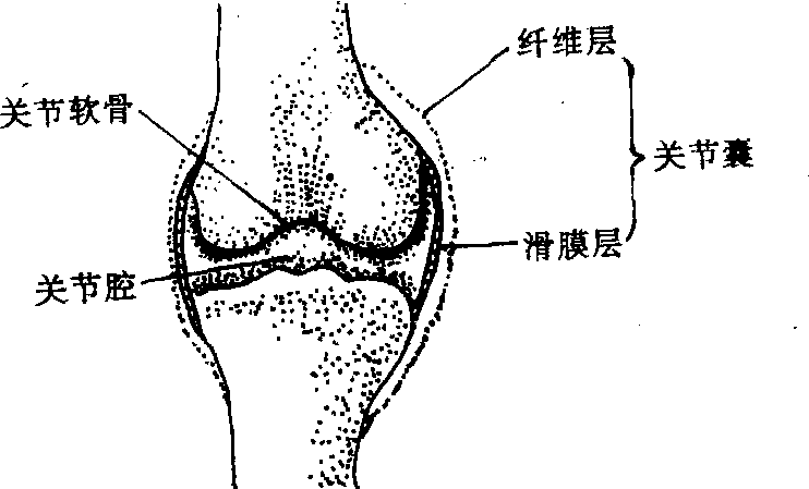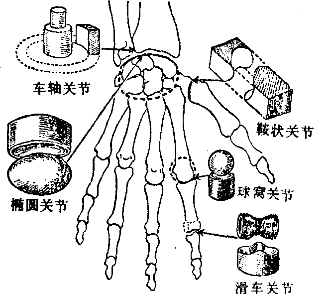 图488 关节的类型 关节两块骨或更多骨连接在一起,连接部分具有一定活动功能的,叫做关节。关节由关节面、关节囊和关节腔组成(见图1.3-3)。关节面上覆盖着关节软骨,其表面光滑,有利于关节运动,而且关节软骨的弹性好,可缓和运动时的冲击和震荡。关节囊是密封的,其腔称为关节腔。关节囊分为外层和内层,外层为纤维层,结构坚实。内层为滑膜层,可分泌滑液,滑液在关节腔内有滑润关节、减少运动时关节面间摩擦的作用。不同关节的结构特点不同,与其功能有密切关系,例如膝关节的关节面平坦,接触面大,关节囊紧张,因而活动度小;而肩关节的关节面弯曲度大、关节囊松弛,关节活动灵活。