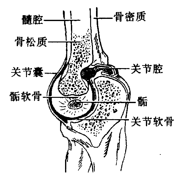| 释义 | 关节guanjie能活动的骨连结叫做关节,它是骨连结的主要形式,一般由关节面、关节囊和关节腔三部分构成。关节面是两个以上相邻骨的接触面,一个略凸,叫关节头,另一个略凹,叫关节窝。关节面上覆盖着一层光滑的软骨,可减少运动时的摩擦,软骨有弹性,还能减缓运动时的震动和冲击。关节囊是很坚韧的一种结缔组织,把相邻两骨牢固地联系起来。关节囊外层为纤维层,内层为滑膜层,滑膜层可分泌滑液,减少运动时的摩擦。关节腔是关节软骨和关节囊围成的狭窄间隙,正常时只含有少许滑液。有些关节还有一些辅助结构: 如韧带是连结骨与骨之间的结缔组织束,成为关节囊的增厚部分,可加强骨连结的稳固性; 关节盘或关节半月板是位于两关节面之间的纤维软骨,能使两骨关节面的形状相互适应,减少运动时的冲击,有利于关节的活动。关节在肌肉的牵引下,可作各种运动。运动形式有: 屈是相连两骨之间的角度减小,伸是角度增大; 内收是肢体向正中矢状面靠拢,外展是离开正中矢状面; 旋转是骨绕本身的纵轴(垂直轴)转动,如肢体的前面转向内侧是旋内,肢体的前面转向外侧是旋外; 屈、伸、内收、外展的复合运动即是环转,这时骨近端在原位转动,远端作圆周运动,全骨运动面呈圆锥形。
