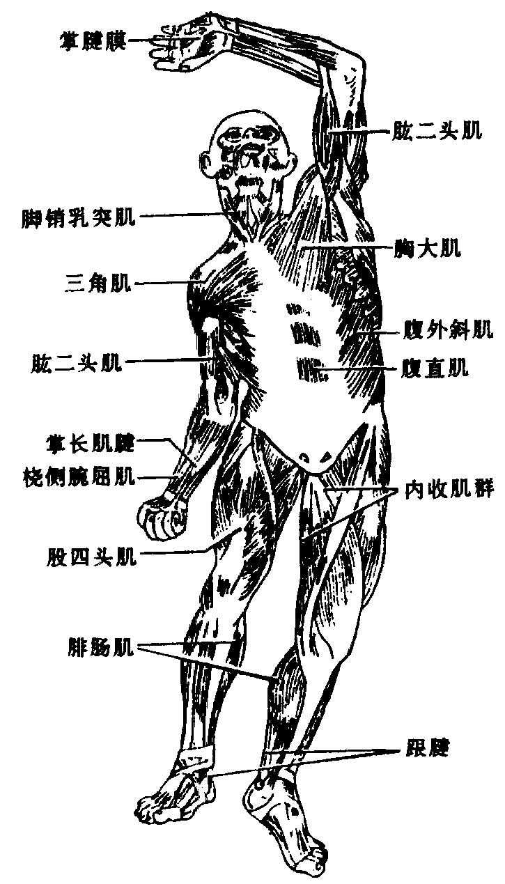 图1.3-4 肌肉 关节guanjie骨与骨之间能活动的连接。有的骨连结不能活动,如脑颅骨的连接; 有的能稍微活动,如椎骨的连接,这些都不能称作关节。关节是骨连接的主要形式。全身各关节都由关节面、关节囊和关节腔构成(见图)。关节面是组成关节的相邻两骨的接触面、其中一个为凸面,另一个为凹面。关节面上覆盖着一层软骨,有减少两骨间摩擦和减轻两骨相撞的作用。附着在关节面周围及其附近骨面上的结缔组织为关节囊,把两骨牢固地联系起来。囊腔内表面能分泌滑液,以减少骨与骨之间的摩擦。关节囊内的空腔为关节腔,内含少量的滑液。关节腔内为负压,对维持关节的稳定性有一定的作用。关节囊的外面还有一些坚韧的韧带,把两骨更牢固地联系住。关节的这种结构,既牢固,又灵活。