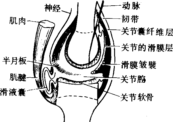 ❷关节囊:为附着在相邻关节面周缘及附近骨表面的结缔组织囊,内含血管和神经。关节囊的内层为滑膜层,可分泌滑液,起润滑作用。有的滑膜内面有小的突起和皱襞。有的皱襞内有脂肪成为滑膜脂肪垫。这些结构有扩大滑膜面积、增加分泌、填充关节腔和稳定关节等作用。关节囊的外层称纤维层,一般是负重大活动范围小的关节较厚,而负重小活动灵活的关节较薄。纤维层局部增厚可形成韧带,具有加固关节的作用。