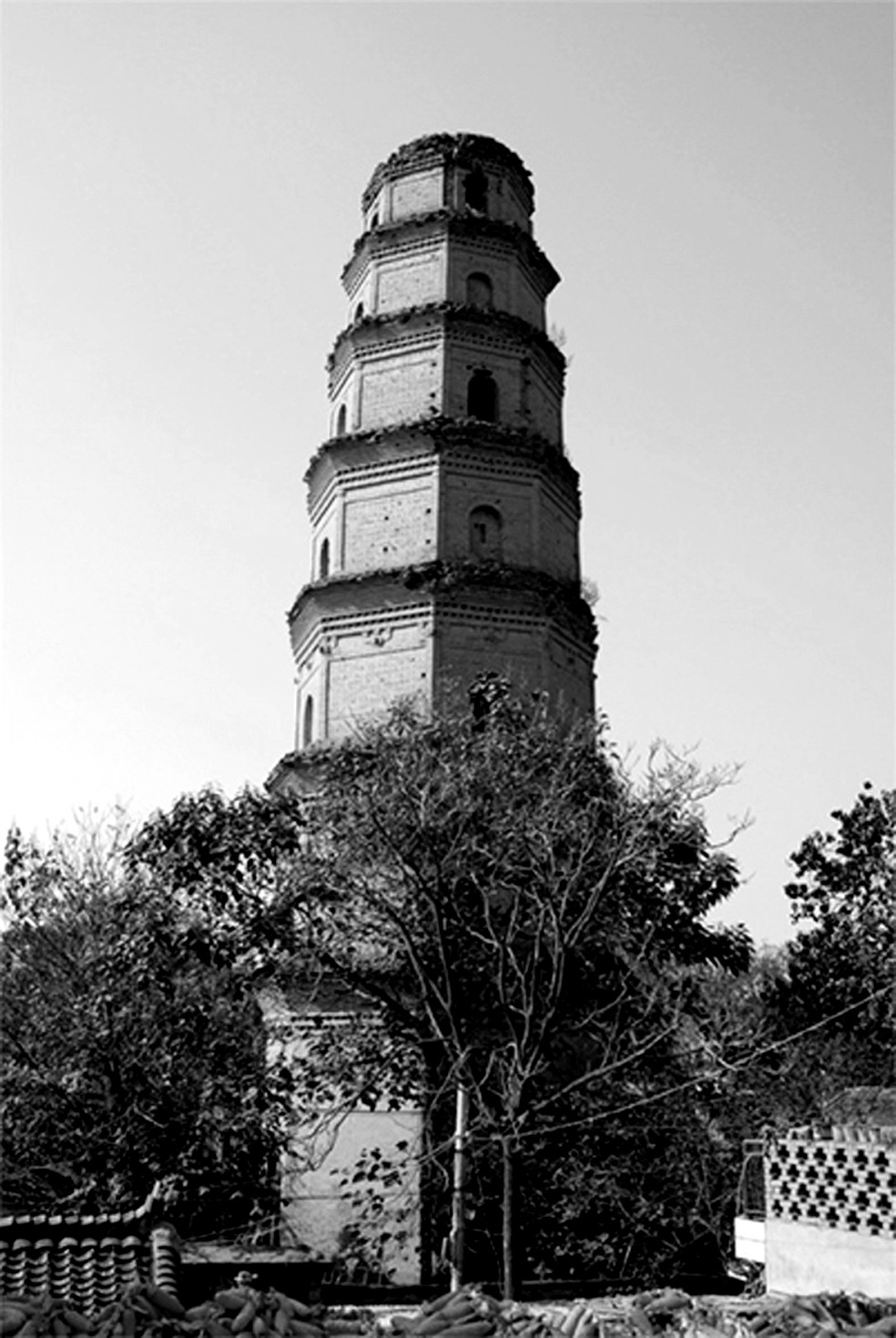 | 释义 | 兴平北塔佛塔。位于今陕西兴平县城内孙刘巷县印刷厂内。唐代建砖塔,平面呈八角形,7层,高38.6米,底层每面长43.5米。塔每层南、北面均辟有门,各层每角有砖柱; 第二、三层每角筑有转角和斗拱。1955年曾作过小修补。 兴平北塔xingping beita位于兴平市北寺巷。八角七层楼格式砖塔。其南500米处原有与此塔同时建造的七层四方形砖塔1座,两塔对峙,俗称“双塔”,南面的称南塔,北面的称北塔。南塔因严重倾斜,危及居民安全,已于1963年拆除,现仅存北塔。北塔原为唐代清梵寺内建筑,建于贞观元年(627),宋、明、清各代均有修葺。清梵寺于元代改称保宁寺,清代重修。今寺已不存。塔残高38.6米,底边长4.35米。塔身每层南、北两面辟券门或假券门,上下真假相间。塔壁作仿木结构,以砖砌出角柱、阑额、菱角牙子。层间叠涩出檐,一至三层檐下隐作斗拱,补间铺作一朵。塔顶残毁。一说该塔为佛教东传、丝路西通的纪念塔。有清代“重修保宁寺并建万寿宫碑”。1986年,北塔旁重建三间佛殿,有赵朴初题写的“清梵寺”匾额。1957年公布为陕西省重点文物保护单位。