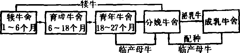 ❸隔栏饲养,拴系和散放相结合的饲养方式,即在舍内设置隔栏,牛在栏内只能站立、躺卧、不能转身。牛可在舍内采食饲料和饮水,也可自由进入运动场采食干草。奶牛的饲养 一般分三个阶段,即犊牛期1~6月龄;育成期7~18月龄;青年期19~27月龄。成乳牛使用年限一般为6~7胎。奶牛饲养工艺流程见图。肉牛饲养主要有两种方式,一种是肉牛的整个生产过程都在牧区草场进行,冬季补喂青贮饲料和精料。另一种是牧区繁殖和饲养犊牛,育肥转到农区舍饲。役用牛常采取简易棚圈饲养。