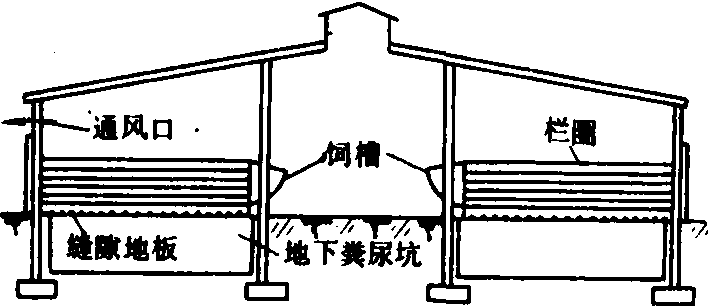 清粪设备 决定于栏圈的地面形式。如是干土地面,则在上面定期添加垫草,待羊群育肥结束出栏时,由铲式清粪机将粪和垫草一起清出。如是缝隙地板或金属网地面,则不用垫草,粪尿直接漏入粪尿坑内,由设在羊舍两端的粪尿泵将其定期抽入贮粪池。