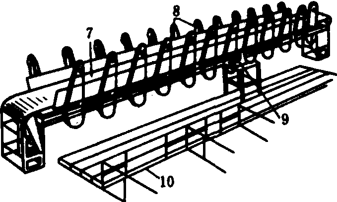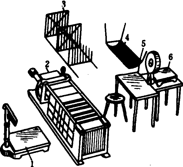 1.毛包磅秤; 2.羊毛打包机; 3.羊毛分级箱; 4.羊毛分级台; 5.记录员工作台; 6.套毛磅秤; 7.羊毛输送带; 8.剪毛机; 9.磨刀机; 10.剪毛台