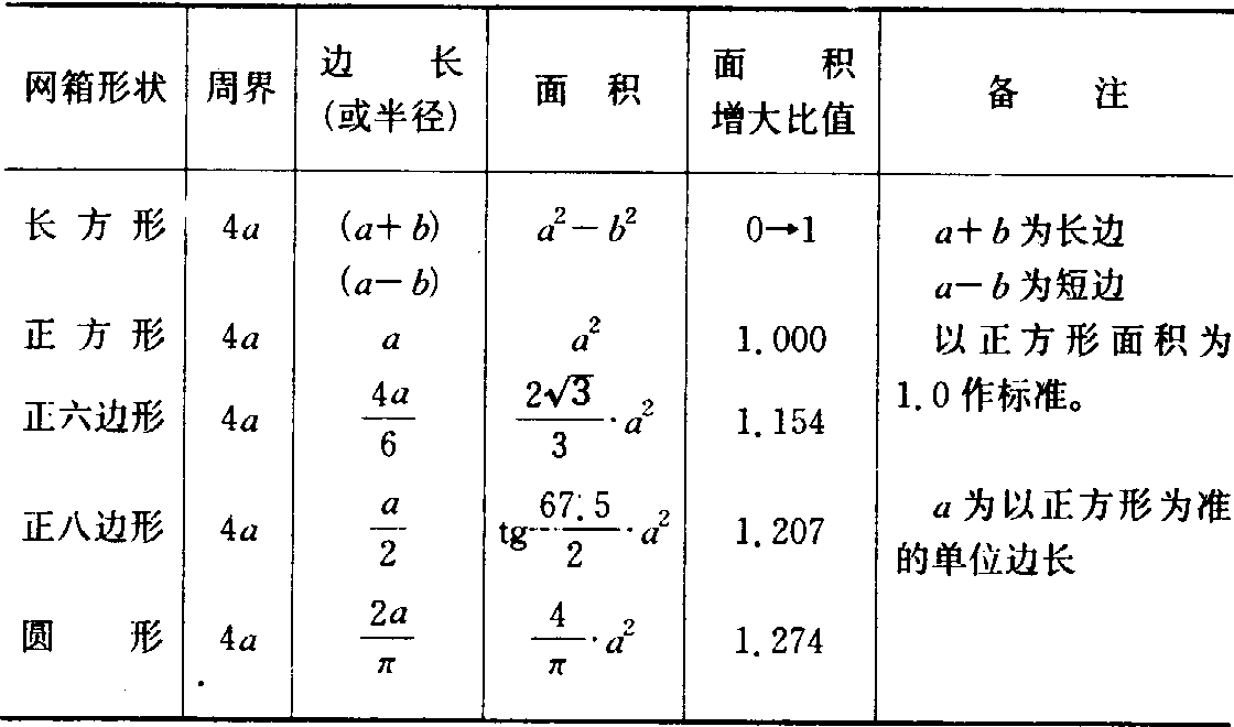 网箱设计 包括网箱的形状、面积、深度和网目的大小:❶网箱形状。除正方形的以外,正向多边形或圆形方向发展。从理论上计算,在深度相同的情况下,多边形或圆形的网箱用材最省,但制作上正方形或长方形的网箱较为方便。在网箱深度相同的情况下,用定量网材制成的各种形状的网箱,其面积是不相同的(见表)。