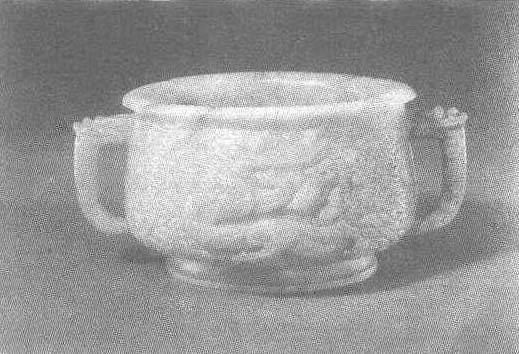 | 释义 | 兽耳云龙纹玉炉宋。高7.9厘米,口径12.8厘米。北京故宫博物院藏。这是一件仿青铜簋造型的玉制品。玉料青中泛灰,曾经火烧。侈口,器身上小下大,圈足,双耳刻出兽头。器腹上以工字纹为地,浮雕出三爪腾龙,水波翻滚,祥云朵朵,具有恢宏的气势,有典型的宋代云龙纹风格。器内底部刻清高宗弘历御题七言诗一首。