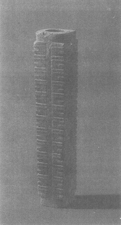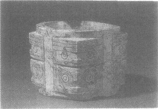 兽面纹玉琮铜石并用时代良渚文化。高29.5厘米,上边宽6厘米。1982年江苏省武进县寺墩墓葬出土。江苏省南京博物院藏。此琮以透闪石磨琢而成,色泽为青灰。形制为长筒形,方柱体,内圆外方,上大下小,圆洞为对钻而成。全器以凹槽为隔共分13节,每节以器四角做中线,刻两个圆圈和若干道凸纹组成四组象征性的兽面纹。关于玉琮的用途,现最为普遍的看法认为它是与原始宗教活动有关的祭祀之器。与此类似的传世品存世较多,北京中国历史博物馆、故宫博物院、上海博物馆及台北故宫博物院,国外的英国伦敦大英博物馆都有收藏。有的高达40多厘米。这些玉琮以前均定为西周,直到近年江苏、浙江等地的良渚文化中不断发现这类玉琮,才证实了它的制作年代。良渚文化见“兽面纹玉圆筒形器”条目。