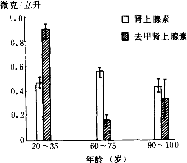 图1-24 男性不同年龄血中肾上腺素和去甲肾上腺素的含量 甲状腺和甲状旁腺 老年人甲状腺的重量常随着年龄的增长而减轻,临床上甲状腺结节的发生率升高,但大多数研究均未证明其功能失常。血浆蛋白合成甲状腺素和游离甲状腺素均不随年龄的增长而变化。 甲状旁腺激素的分泌随增龄而下降,但骨质疏松症患者则升高。 性腺 男性老年人的贮精囊和前列腺重量减轻。由于睾丸内分泌细胞数量减少,合成类固醇能力减弱,因此睾丸的内分泌功能和产精能力随增龄而降低,但少数年过80的老年人仍保持产精能力。血浆总睾酮和游离睾酮有随增龄而下降的趋势;血浆总睾酮于50岁以后,游离睾酮于20岁以后分别开始下降。但目前尚无充分证据说明睾丸功能的下降可影响老化。 妇女绝经后,卵巢萎缩,滤泡消失,卵泡不再分泌雌激素和孕酮,这时只剩下肾上腺产生雌激素。黄体酮主要是由卵巢和胎盘产生的,少量由肾上腺皮质产生,在生育期之后,其产生和排出量均急剧下降,从青春期到老年期,其产生率下降约60%。女性性器官副件的萎缩是由于卵巢激素缺乏而引起的,故用雌性激素治疗可使其恢复,但随着增龄性器官副件对雌激素的反应越来越迟钝。 胸腺 胸腺既是一个中枢免疫器官,又是一个内分泌器官。人的胸腺自成熟期开始退化,随后免疫功能下降。人到老年,胸腺将前体细胞转变为T细胞的能力降低,因此血浆胸腺素浓度低下。 胰腺 老年人对葡萄糖的耐受量明显减低,如到75岁时,2小时平均血糖值比成年人每100毫升血液高30毫克。这是由于老年人胰岛素分泌减少,或由于胰岛素受体对胰岛素敏感性降低所致。 |