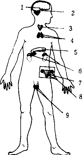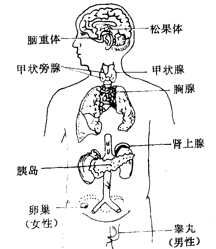图1—20 人体主要内分泌腺的分布 内分泌腺endocrine gland又称无管腺。动物体内直接将分泌物释放入血液、淋巴或细胞间的腺。分泌物微量称激素。腺细胞聚集成团、索或滤泡状,其间毛细血管丰富,细胞有一面贴附血管。据分泌物化学性质,有分泌肽类和蛋白质类激素细胞以及分泌甾体类激素细胞两种。有些内分泌腺是单独器官,有些是存在某种器官内的细胞团,也有散在分布的单个内分泌细胞。分泌物被运送到机体各专一的接受器官、组织和细胞,对其生理功能起调节作用。 |