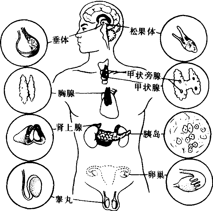 1.松果体 2.脑垂体3.甲状腺与甲状旁腺 4.胸腺 5.胰岛 6.肾上腺 7.子宫 8.卵巢 9.睾丸 人体内分泌腺 甲状腺是人体最大的内分泌腺,位于气管上端甲状软骨两侧,甲状腺激素由腺泡细胞分泌,其作用是:促进组织细胞内的物质代谢,使肌体耗氧量和产热量增加,对人体体温的调节有重要意义;促进机体生长发育,尤其是骨骼的发育;促进中枢神经系统的发育。当甲状腺功能亢进时,体内物质代谢加速、氧耗增加,则基础代谢率高于正常,病人身体消瘦。甲状腺功能低下的婴儿,生长迟缓,智力减退,表现为呆小症。碘是合成甲状腺激素的重要原料,地方性甲状腺肿是由于食物和饮水中,长期缺碘,甲状腺代偿性增生,肿大,以增加甲状腺激素的合成。海带中含碘丰富,经常食用可预防此病。 脑垂体是体内最重要的内分泌腺,它能分泌多种激素。❶生长激素能促进全身的生长发育,若幼年时分泌不足,则身体不能长高,但智力正常,称侏儒症;相反分泌过多时患巨人症。 ❷促甲状腺素,促肾上腺皮质激素和促性腺激素等激素,分别作用于同名的内分泌腺或细胞,促进相应激素的合成和释放。 ❸抗利尿激素,是由下丘脑内的神经细胞分泌,贮存于脑垂体中的激素,它作用于肾脏,促进水的重吸收,缺乏时发生多尿,称尿崩症。垂体激素还有生乳素和催产素等。 胰岛位于胰腺腺泡间,胰岛细胞有多种,分别分泌不同激素,其中β细胞分泌胰岛素,其作用是加速血中葡萄糖的利用或转变,使血糖浓度下降。当胰岛素分泌不足时,血糖升高,尿中有糖排出,引起糖尿病。 内分泌系统与神经系统配合,共同调节机体的各种生理功能,称神经一体液调节,使机体更好地适应体内外环境变化。 内分泌腺见“腺”。 内分泌腺指分布于人体一定部位没有导管的腺体,故又称无管腺。其分泌物为激素,借血液或淋巴输送至全身以发挥作用。内分泌腺细胞大多排列成团块状、索状或板状,只有少数呈囊泡状(如甲状腺)。内分泌腺可分为两类,即内分泌器官和内分泌组织。内分泌器官是指独立存在、肉眼可见的腺体,如垂体、松果体、甲状腺、甲状旁腺、肾上腺等。内分泌组织是指存在于其他器官内的腺组织,肉眼难以分辨,如胰腺内的胰岛、胸腺内的网状上皮细胞、睾丸内的间质细胞和卵巢内的卵泡及黄体等。此外,还有许多器官,如胃肠道、胎盘、肾脏以及神经系统等,也兼有内分泌功能。如神经末梢分泌神经介质,丘脑下部分泌血管加压素和催产素,胃幽门窦粘膜分泌促胃液素,十二指肠粘膜分泌胆囊收缩素等(图1—20)。