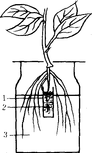 1.盛药液的玻璃瓶;2.切断的主根;3.营养液