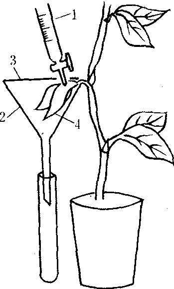 1.盛药液的滴定管; 2漏斗; 3.覆盖玻璃片,上有小孔;4.处理叶片