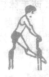 动作要领 手正握直臂体前撑杠,用大腿后部坐于后杠, 腿并拢伸直自然下垂。挺胸、立腰、梗头。 保护与帮助 保护者站在练习者杠内侧位置, 双手扶双腿, 避免下滑。 教学重点 大腿后部用力靠杠,直臂撑杠、立腰。 |
