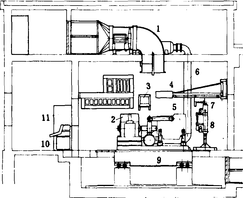 1.进风系统; 2.测功器;3.燃油箱;4.测量信号传输电缆汇集架;5.内燃机;6.排气系统; 7.冷却水箱;8.冷却水温度调节控制装置;9.弹性基础;10.操纵台; 11.测量柜