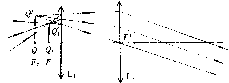 | 释义 | 冉斯登目镜Ransideng Mujing一种通用的目镜。英国光学仪器制造者J.冉斯登发明。由同种玻璃制成的两个相同的平凸透镜L1和L2组成。向场镜L1和接目镜L2都是平面向外,二镜之间的距离为单个透镜焦距的2/3~3/4。由计算可知,整个目镜系统的前焦点F在L1外侧,后焦点F′在L2的外侧(图1)。由前面物镜所成的实像Q1Q′1位于整个目镜系统的前焦点F处,此像对L1为实物(对整个目镜也是实物),它经L1在L2的前焦点F2处成一虚像QQ′,它对L2是一个实物,于是QQ′经L2在无穷远处成一放大的虚像,以供眼睛观察。冉斯登目镜的物面(即整个目镜系统的前焦面)位于L1的外侧一定距离处,所以可在该面上放一带有刻度的透明标尺,此透明标尺将与Q1Q′1一起按同样比例放大成为供眼睛观察的虚像。这样就可通过标尺进行定量测量,克服了惠更斯目镜在这方面的缺点。冉斯登目镜的镜目距比惠更斯目镜的要长,可达12毫米,使用比较方便;视场与惠更斯目镜大致相同,约30°~50°。冉斯登目镜广泛用做测量显微镜和望远镜的目镜,也常单独用作放大镜观察和测量实际的微小物体。