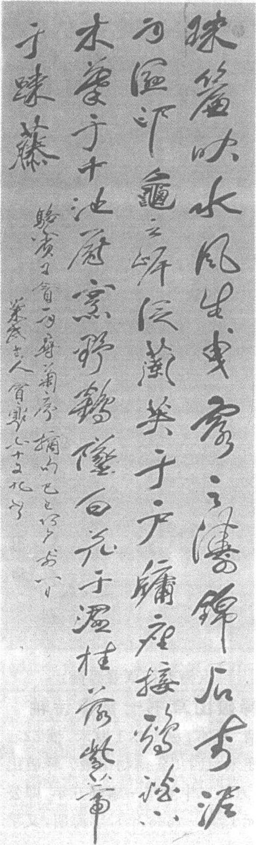| 释义 | 冒襄行书骆宾王冒雨寻菊序摘句轴清。纸本。纵191.7厘米,横56.7厘米。四川省博物馆藏。冒襄(明万历三十九年—清康熙三十二年,即公元1611—1693年),字辟疆,号巢民,又号朴庵、朴巢。江苏如皋人,明诸生,十岁即能赋诗,诗词文章出众。明崇祯十五年副贡生,史可法曾以人才荐,次年授台州司,不赴,入清不仕。康熙十八年征应博学鸿词科,辞不赴。与侯方域、陈定生、方以智有“明末四公子”之称,曾参与了反马、阮的门争。明末后,隐居不仕,家财富有,于家中水绘园内,云集四方名士,以诗酒自娱,风流文采,映照一时。善书,法晋人,师事董其昌,作擘窠大字特妙。亦间作山水花卉,书卷气盎然。清韩菼《有怀堂集》云:“书法特妙,善作擘窠大字,人皆藏弆珍之。”著有《朴巢诗选》、《朴巢文选》及《影梅庵忆语》等。《清史稿》卷五百一有传。此书:“珠帘映水风生曳露之涛锦石封泥雨湿印龟之岸泛兰英于户牖座接鸡谈下木叶于中池厨烹野鹤坠白花于湿桂落紫蒂于疏藤。”款署:“骆宾王冒雨寻菊序摘句,已巳巧夕前一日巢民老人冒襄七十又九书。”款下钤朱文〈巢民辟疆〉、白文〈祖孙父子三休林□〉两印。书体师法董氏,结字及笔法有苏字味道,并有晋唐行书之神韵。多以侧锋运笔,笔力遒劲俊美,线条柔姿轻巧,体势妍媚清秀,是冒襄晚年书法之精品。