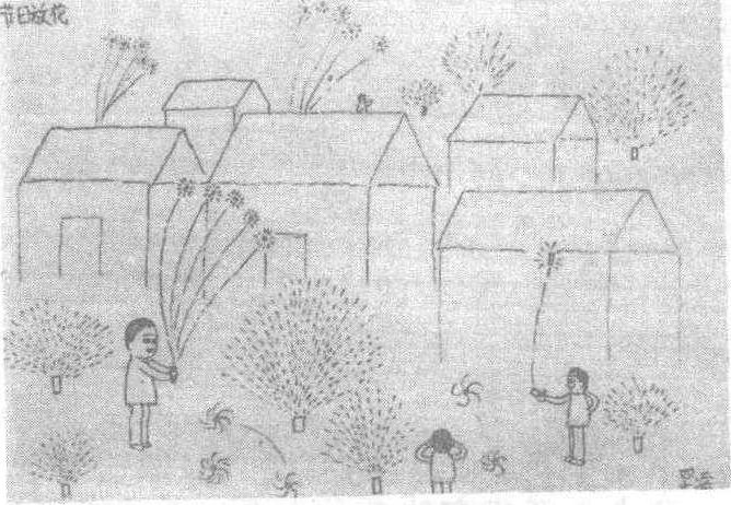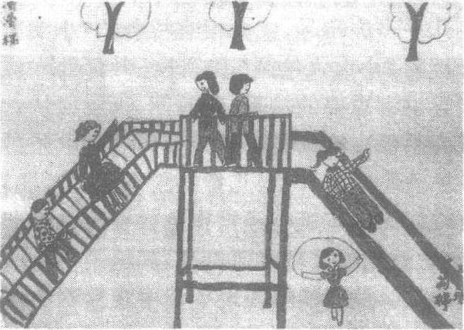 细,出现三维空间的轮廓表现。某些物象局部符合透视的真实(图10),其余仍处于意象期绘画面貌。小学四年级的学生绘画面貌变化最大,开始脱离意象期的画法,但在技术上感到困难,线条软弱无力且用虚线画轮廓,并不断修改错误之处,画面缺少一、二年级时的活泼生气。从此,多数儿童不再像以前那样喜欢绘画,形成儿童绘画的低谷。
