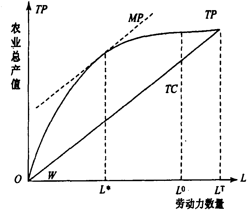 如图5所示,图中TP线和TC线分别代表农业总产量和劳动力总成本(总工资)。MP是TP的切线,代表第L*个工人的边际生产率。LT为劳动力总数。W为工资率。起初,总产量随着劳动力数量的增加而增加,但由于土地的数量有限,总产量增加的幅度越来越小。当劳动力数量超过L0以后,尽管劳动力数量增加,总产量也不再增加了。但劳动力的总量是LT,他们都要生存,要得到工资,因此总产量要在全部劳动力中进行分配。图中的斜线TC是劳动力总成本线,表示向劳动力支付的总工资。LT个劳动力把总产量瓜分净尽。平均工资水平Ⅳ正好是TC线的斜率。