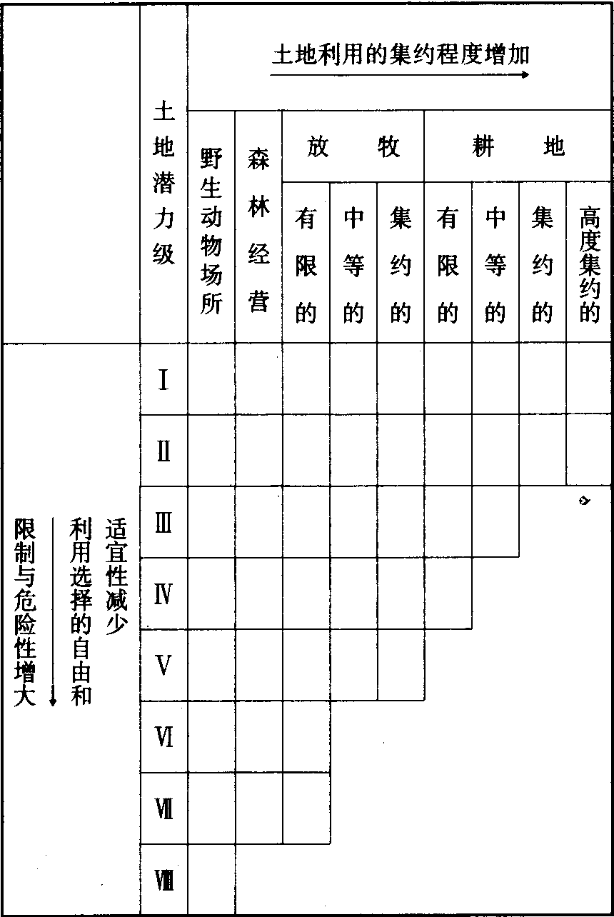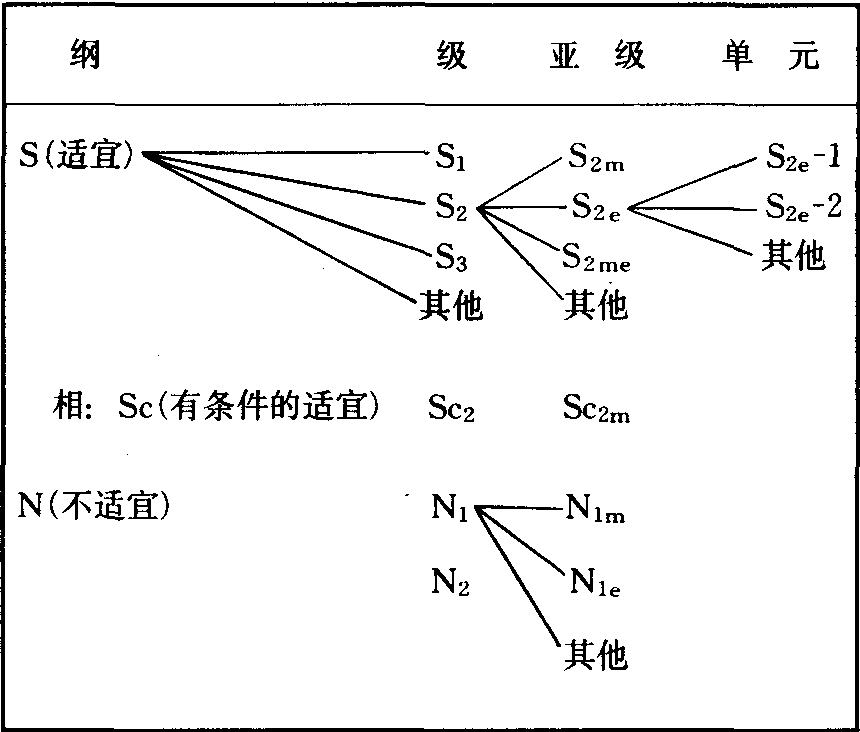 划分土地潜力等级的步骤 可分为三步进行。❶划分土地潜力级。按土地性能与土地用途的关系分为3级:第一适宜耕种和其他用途的土地(Ⅰ—Ⅳ级)。第二在利用上受限制的土地(Ⅴ—Ⅶ级)。第三不适宜农、林、牧业利用的土地(Ⅷ级)。 ❷划分潜力亚级。按土地利用中4种限制因素划分,并将限制因素分别以符号表示。侵蚀危险亚级以“e”表示,是指侵蚀作用是土地利用中的主要问题,对现代侵蚀的敏感性和古代侵蚀的破坏程度是划分亚级的主要依据。潮湿、排水或泛滥亚级用“W”表示,是指水分过多的土地,过多的水分是土地利用中的主要限制因素。土壤排水不良、潮湿、地下水位高和泛滥等是划分该亚级的依据。根系层亚级以“S”表示,是指根系层浅薄,或其中含有大量石块、持水容量低、肥力低、多盐分或含钠盐等限制因素的土地。气候亚级以C表示,指气候中的温度和湿度是土地利用中的主要限制因素的土地。上述限制因素除气候之外,均可以改良或局部改良,在确定潜力亚级时应予优先考虑。根据土地利用中的主要限制因素,把土地归入相应的潜力等级,除气候外,不受别的因素限制的土地,则归属“C”亚级。如果土地具有两种限制程度相等的可以改造的限制因素时,则按e、W、S、C的顺序划分。潜力级中的Ⅰ级不含潜力亚级,因为该级在土地利用上很少受到限制,适宜广泛的植物生长。 ❸划分潜力单位。它是指一组土地,它们对于植物有相似的适宜性和经营管理措施,土地特征组合充分一致,具有相同的潜力、限制或危险的性质。 联合国粮农组织的土地适宜性分类 土地适宜性分类共分4级: 土地适宜性纲 根据拟议中的用途,将土地评价为“适宜”或“不适宜”,分别用S和N表示。其中S纲为适宜,这类土地按考虑的用途,持续利用预期能产生足以抵偿投入的收益,而且没有破坏土地资源的危险。N纲为不适宜,这类土地的质量不能按考虑的用途持续利用。 土地适宜性级 反映适宜性的程度,可按照纲内适宜性程度递减的顺序用连续的阿拉伯数字表示。“适宜纲”内,级的数目不作规定,可以只有2级(S1和S2),最多约可分为5级,主要视需要而定。目前大多采用3级,其中,S1级为高度适宜,土地对某种用途的持续利用没有重大的限制,或只有较小的限制,不致显著降低产量或收益,并且不会使投入提高到超出可接受的程度。S2级为中度适宜,土地对指定用途的持续利用有中等程度的限制性,这些限制将减少产量和收益,并增加所需的投入,从这种用途虽能获得利益,但明显低于S1级的土地。S3级为勉强适宜,土地对指定用途的持续利用有严重的限制,将会降低产量和收益,或增加必需的投入,收支仅仅勉强达到平衡。如果需要作更细致的分类,则可增加一级,如S4,这就要改变级的含义,例如,对农耕地用4级,而对林地只用3级;那么,“勉强适宜”级对前者是S4,而对后者是S3。适宜性程度的差别主要决定于投入和收益的相互关系,收益可以由实物(如作物、畜产品或木材)构成;为得到这些收益所必需的投入包括资金、劳力、肥料和动力。适宜性各级之间的界限应随时根据技术进步和社会经济条件的变化加以检验和调整。“不适宜纲”内通常分2级,其定义如下:N1级为当前不适宜,土地具有短期能克服的限制性,但在目前技术水平及经济成本合算情况下,不能改变这种限制性;限制性的严重程度达到在既定方法下不能保持土地有效地持续利用。N2级为永久不适宜,土地限制性表现为相当严重,以致在既定方法下不存在有效地持续利用的任何可能性。这两级一般不需要数量的定义,因为对指定的用途都是不经济的。N1级的上限已经由S纲中最低的适宜级的下限所规定。永久不适宜(N2级)的界限常常是自然的和永久的,而适宜和不适宜两个纲之间的界限经过一段时间会随着社会经济条件的改变而变化。 土地适宜性亚级 反映限制性的种类,如土壤水分亏缺,侵蚀危险。亚级用小写英文字母表示,如S2m,S2e,S3me。S1级之下没有亚级、亚级的数目及选择区分亚级的限制性随不同目的而异。但应遵循两个准则:❶亚级的数目应保持在足以区别同一级土地的最低限度,这种区别可能是土地经营管理方面的明显差别,或是由于不同的限制性造成的改良潜力的不同。 ❷对任何亚级应采用尽可能少的限制性,一般用一个字母,少数情况下用两个字母。如果可能,应只使用一个主要符号(即决定该级的符号),如果两个限制性同等严重,则两个都可列出。不适宜纲内的土地可以按限制性的种类划分亚级,如N1m,N1me,当然这不是必需的,因为这种土地都不投入经营利用,不需要再划分适宜性单元。 土地适宜性单元 这是亚级的再度细分,亚级内所有单元具有级水平的相同适宜性程度和亚级水平的相似限制性种类。单元与单元之间的生产特点或经营条件,在细节方面有差别,通常规定为限制性细节的差别。在制定农场规划时可以对它们的划分作详细的规定。适宜性单元可用连接号后加一阿拉伯数字表示,如S2e-1、S2e-2,在一个亚级内划分单元的数目不受限制。 相 为了在某种情况下简单扼要地叙述,可以增加“有条件的适宜性”一项,归属适宜性纲的一个相。“相”可适用于调查区内有小块土地具有某种特定用途,但这种用途在既定的管理条件下是不适宜或适宜性很差的;如果实现了某些条件后可能是适宜的。通常在纲符号与级编